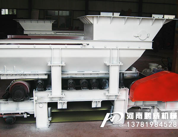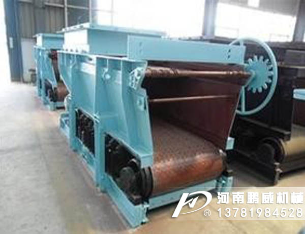 料倉內的物料經連接段進入導料槽落在甲帶上,甲帶靜止時物料最終靠內摩擦力而停止運動,在出料口形成一定的角度的靜止角度堆積;當驅動滾筒在外力的驅動下開始旋轉時,帶動膠帶運動,膠帶帶動其上的甲帶運動,甲帶帶動其上的物料導向出料口,運行中的甲帶在出料口卸載后轉向回程,物料不斷從出料口排出,完成給料過程;二次密封裝置對從導料槽和膠帶之間間隙中漏出的物料提供密封;改變給料量,可通過調節轉臂行星摩擦式無極變速機的調速手輪來改變輸出軸轉速,改變甲帶運行速度的大小,從而改變給料量;改變給料量,也可通過選配變頻器,改變電動機轉速,從而改變給料量。
